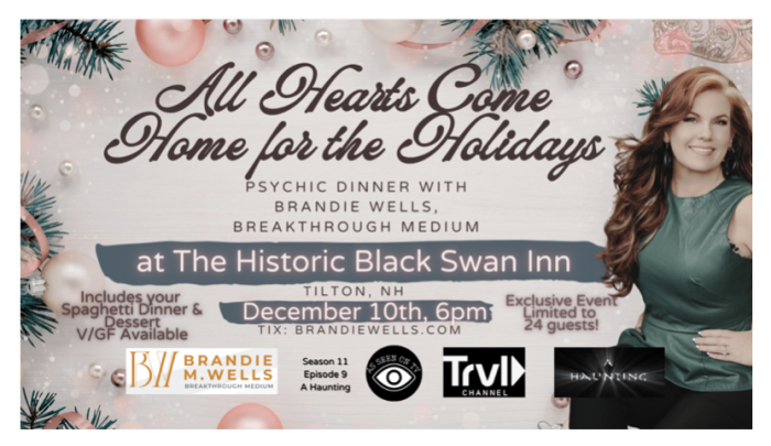 All Hearts Come Home for the Holidays Psychic Dinner with Brandie Wells at The Black Swan Inn ($59) Wednesday, December 10, 2025, at 6:00 pm3 hours @ $59.00