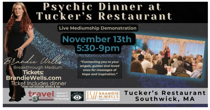 Psychic Dinner with Brandie Wells at Tucker’s Restaurant Southwick, MA | Thursday,November 13, 2025, at 5:30 pm3 hours 30 minutes @ $69.00