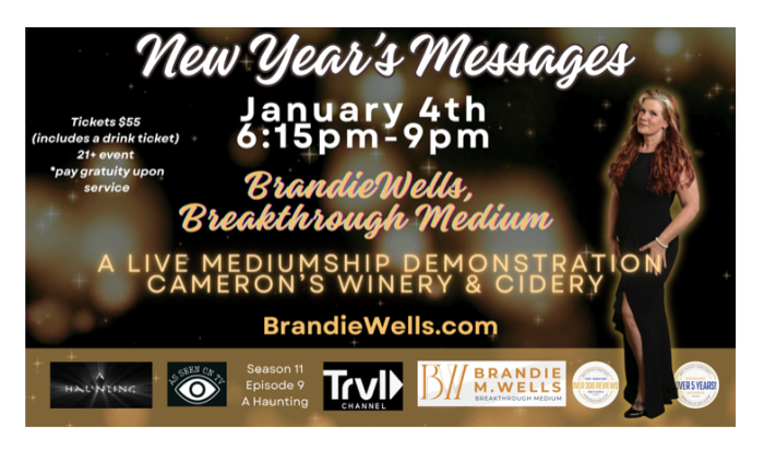 Join us for a transformative evening with Brandie Wells, the Breakthrough Medium, on December 30th! Doors open at 5:30 PM for a special Psychic Dinner featuring Brandie Wells, The Breakthrough Medium. From 7:00 to 9:00 PM, experience a captivating spirit gallery where you can connect with your angels, guides, and loved ones for messages of healing and inspiration. Grab your seats now for this incredible event! *INCLUDES Meal* Does NOT include drinks. *Guest list only/no physical tickets.