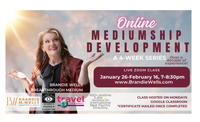 Join International Psychic Medium Brandie Wells; also known as The Breakthrough Medium, for a four part series of exploring mediumship to help you embrace your own Spiritual Abilities on Zoom. From learning to use your own psychic senses to communicating with the Spirit world, this course gives you the building blocks you need. Whether you desire to become a working medium or just want to develop a better personal relationship with the Spirit world, this is the place to start.