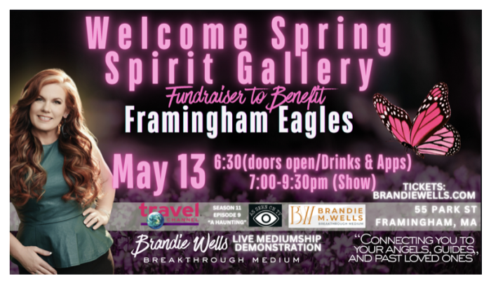Join us for an enchanting evening at the Spirit Gallery on Wednesday, May 13, at the Framingham Eagles, 55 Park Street, Framingham, MA. Experience an open forum where Brandie Wells, known as The Breakthrough Medium, channels messages fr …