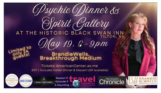 Experience an evening with Brandie at the Black Swan Inn in Tilton, NH, for a Psychic Dinner featuring a Spirit Gallery. Engage in an open forum receiving messages from Spirit guides, angels, animal totems, medical intuition, and past l …