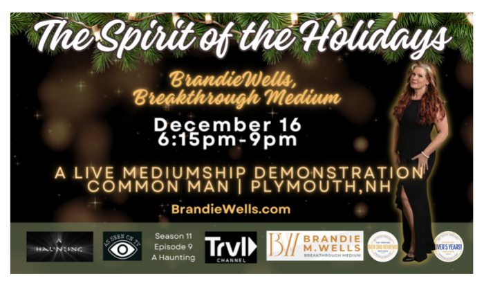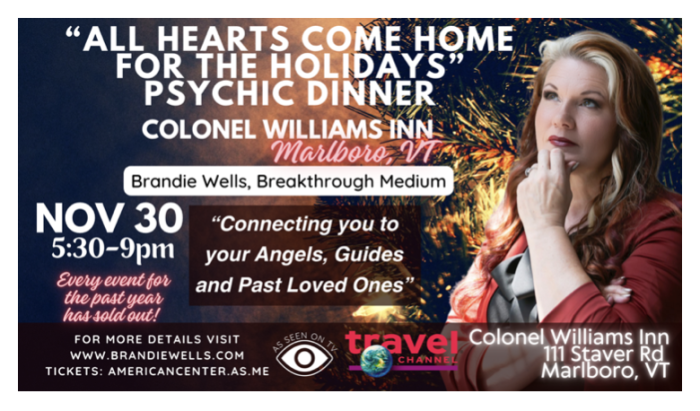 All Hearts Come Home for The Holidays Psychic Dinner with Brandie Wells at Colonel Williams Inn Marlboro, VT | Sunday, November 30, 2025, at 5:30 pm3 hours 30 minutes @ $44.00