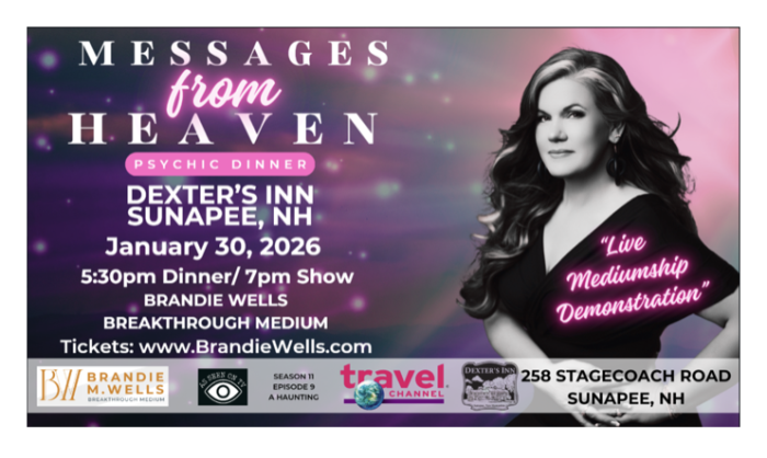 Messages From Heaven Psychic Dinner with Brandie Wells at Dexter’s Inn in Sunapee, NH | Friday, January 30, 2025, at 5:30 pm3 hours 30 minutes @ $44.00