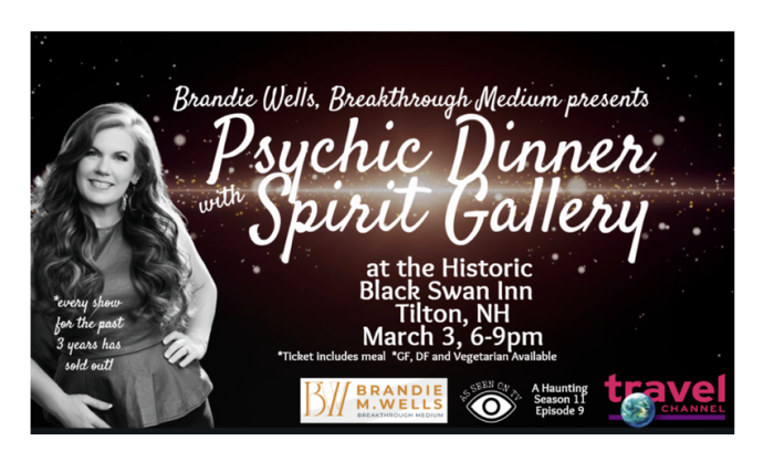 Experience an evening with Brandie at the Black Swan Inn in Tilton, NH, for a Psychic Dinner featuring a Spirit Gallery. Engage in an open forum receiving messages from Spirit guides, angels, animal totems, medical intuition, and past l …